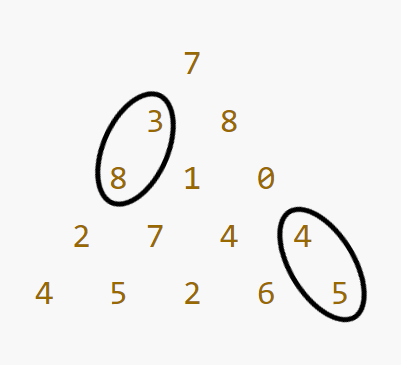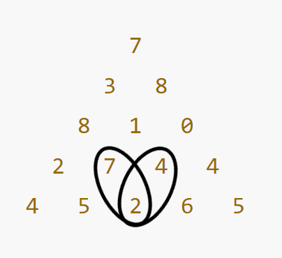 맨 위층 7부터 시작해서 아래에 있는 수 중 하나를 선택하여 아래층으로 내려올 때, 이제까지 선택된 수의 합이 최대가 되는 경로를 구하는 프로그램을 작성하라. 아래층에 있는 수는 현재 층에서 선택된 수의 대각선 왼쪽 또는 대각선 오른쪽에 있는 것 중에서만 선택할 수 있다.