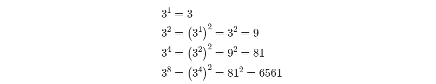 지수를 이진수로 변환한 후 3^1을 3^2 계산에 이용하고 3^2 계산을 3^4 계산에 이용하는 등 연산을 쪼개는 방법을 통해 연산 수를 줄여 시간 복잡도를 낮춘다는 말이다.