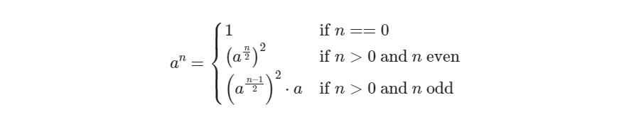 직역하면 이진 지수화로, 거듭제곱 연산을 O(log n) 시간 복잡도로 수행할 수 있는 알고리즘이다.